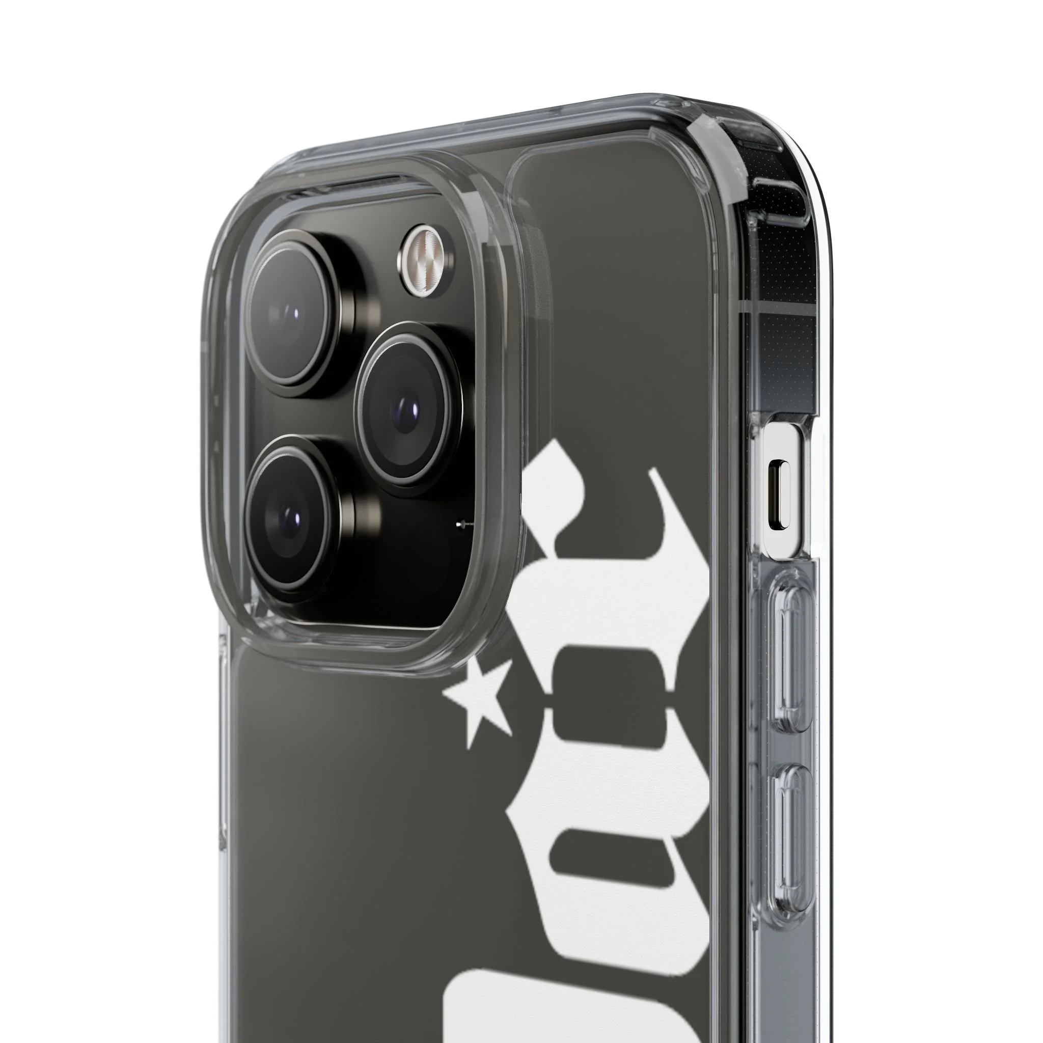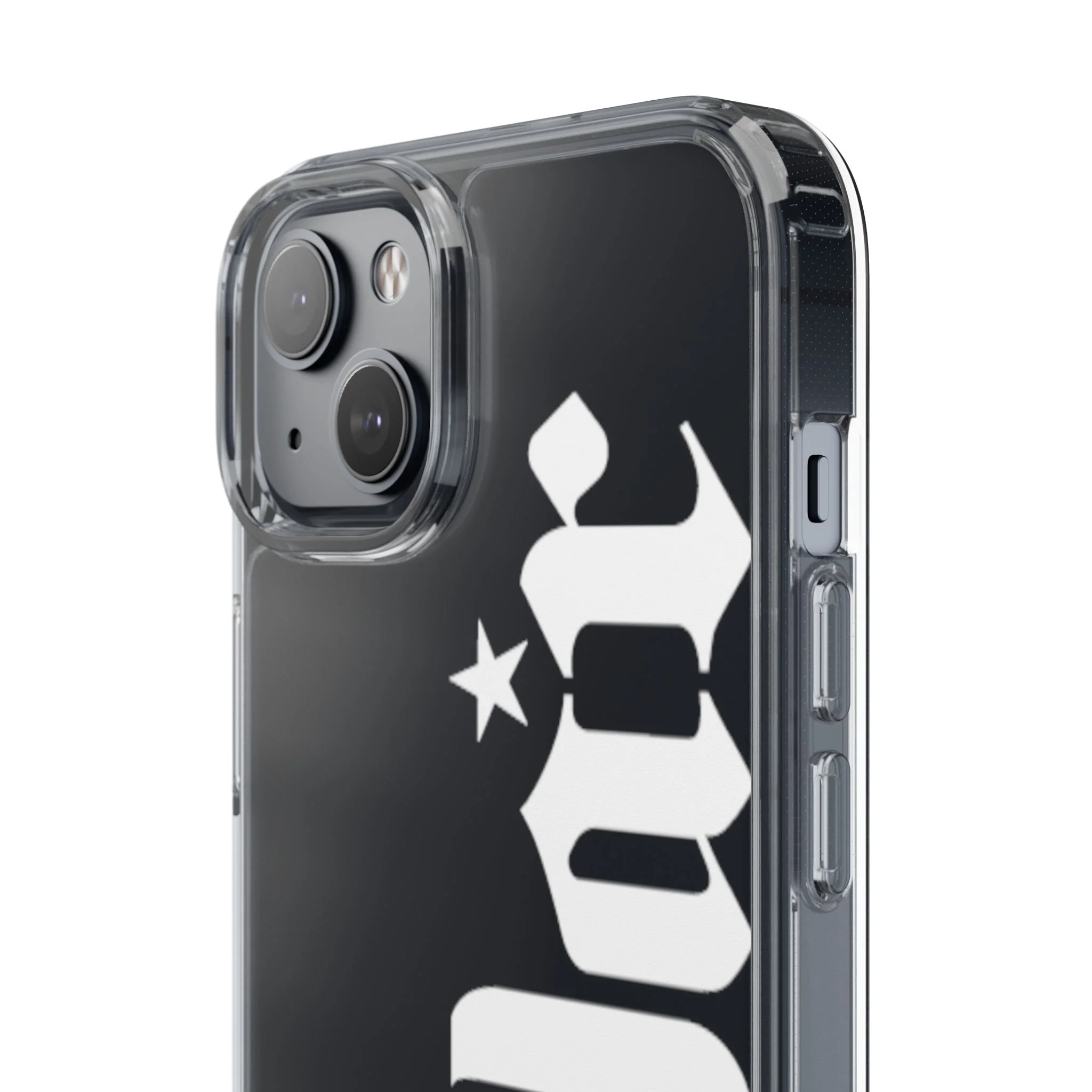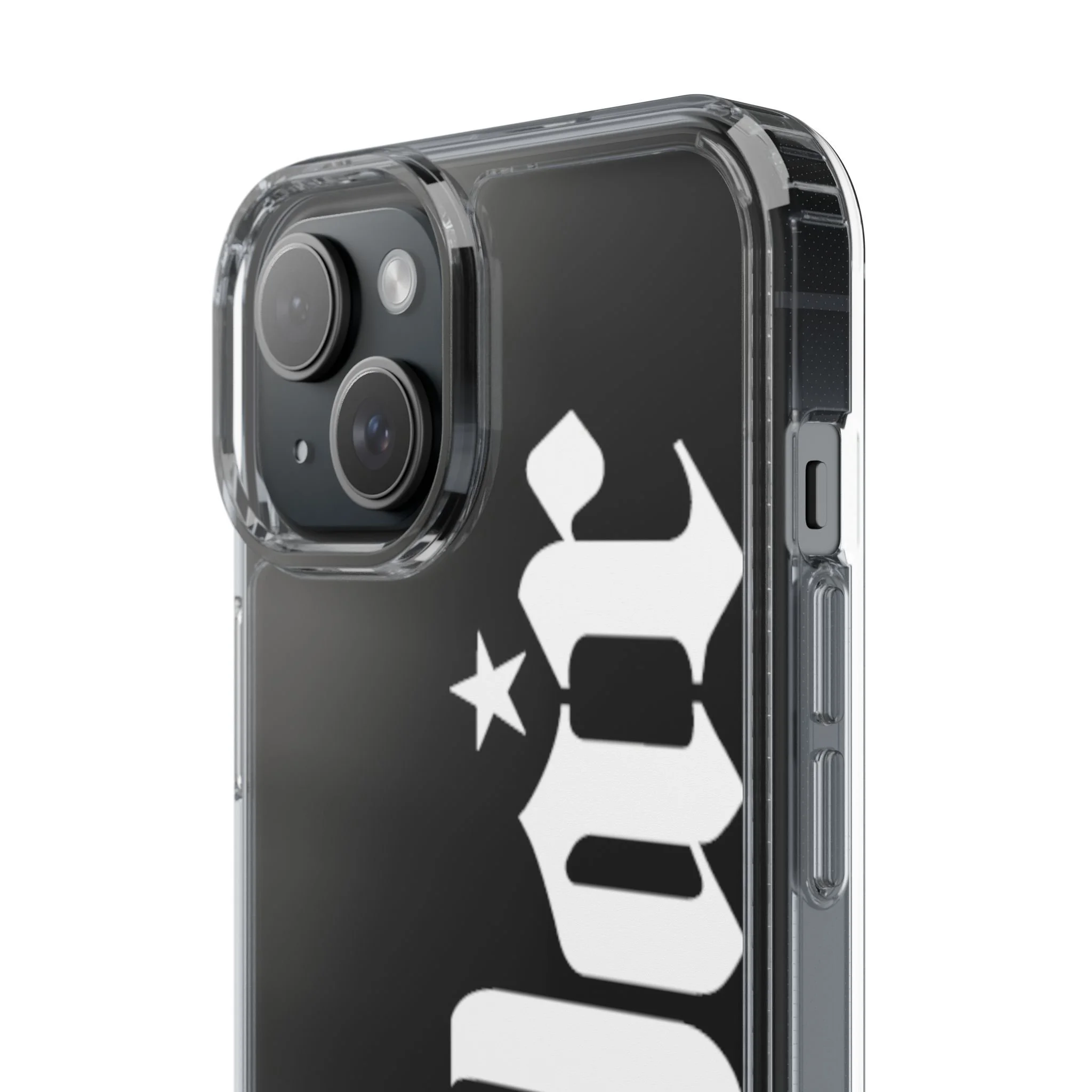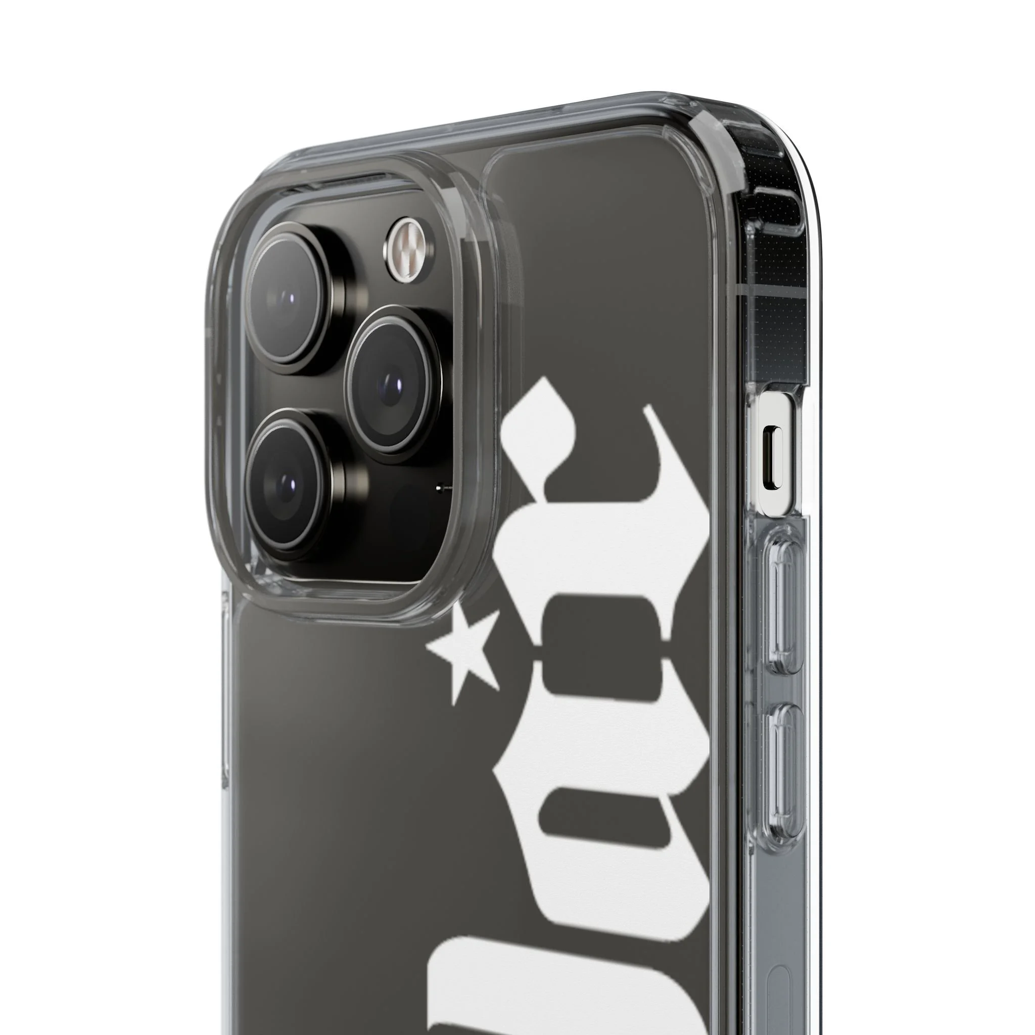A clear, slim phone case that blends minimalist protection with bold, streetwise style. The transparent polycarbonate back and TPU sides keep the phone’s silhouette visible while the shock-absorbing construction guards against everyday drops and bumps. Crisp, high-contrast printing preserves the graphic’s sharp edges and deep blacks so the typographic design reads loud without adding bulk. Thin, precise cutouts keep buttons and ports accessible and wireless charging ready. It’s a case that slips into pockets easily, withstands daily wear, and carries an unmistakable attitude for those who prefer clean lines with a graphic edge.
